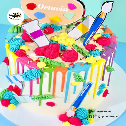 Unleash creativity at your celebration with our vibrant Arts & Crafts Cake – the perfect choice for little artists and colourful party themes. Decorated with rainbow drip buttercream, bold piped swirls, sprinkles, and fun artsy toppers including paintbrushes, paint tubes, and a personalised artist palette, this cake looks like it jumped straight out of a craft studio!