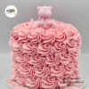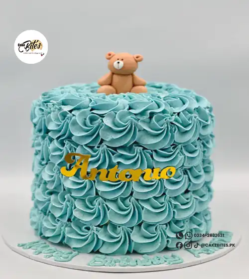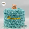 This adorable rosette cake is perfect for baby showers or first birthdays! Featuring delicate swirls of buttercream and topped with a 3D fondant bear that contains sticks for structural support. The cake is also available in baby blue with a brown bear.