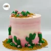 Celebrate with a unique touch of the desert! This charming cactus-themed cake features hand-piped buttercream cacti and delicate pink blossoms, edible sand, and set against a dreamy gradient of soft pinks and creams.