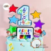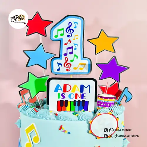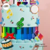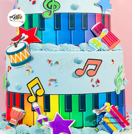 Our Colourful Music Cake is a bold, joyful centrepiece made for music lovers and milestone celebrations. Finished in smooth pastel blue buttercream and wrapped with vibrant rainbow piano keys, this cake is decorated with playful musical notes, instruments and star details for a truly show-stopping design.