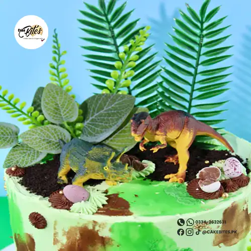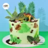Step back in time with this adventurous Dinosaur Jungle Cake! Featuring a vibrant green buttercream base with earthy brown accents, it’s decorated with piped foliage, chocolate “soil,” and mini speckled eggs. The top of the cake showcases a prehistoric scene with lush faux greenery and non-edible dinosaur figurines.