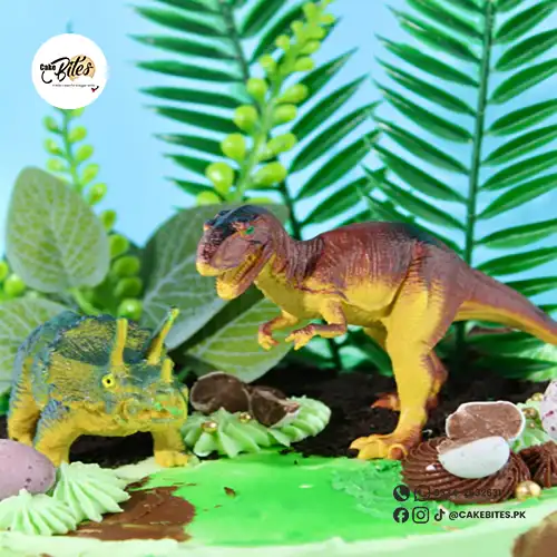 Please note that the colour and design may differ slightly from the image displayed. Furthermore, the dinosaur toppers on top of the cake will be any two of the following: Stegosaurus, Pteranodon, Triceratops, Spinosaurus, Tyrannosaurus Rex (T. rex), or Iguanodon. The cake in the image is an 8″.