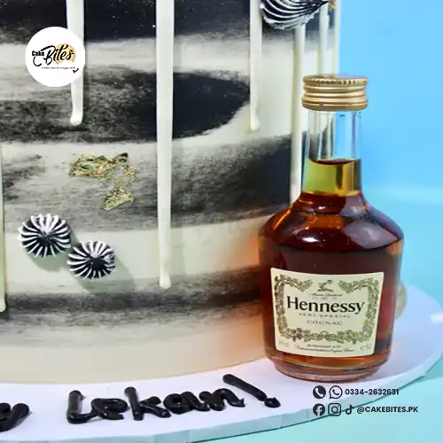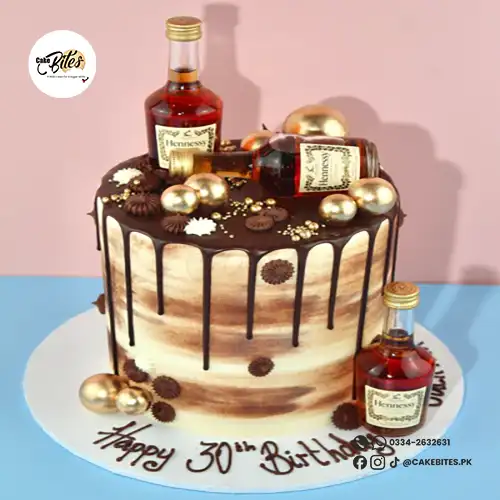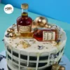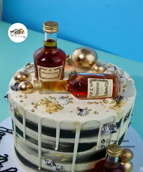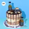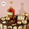 This bold and customisable cake is decorated with non-edible metallic gold spheres, buttercream swirls, and miniature alcohol bottles. You can personalise the base colour, drip colour, and type of alcohol to suit your preference. The cake in the first image is an 8″.