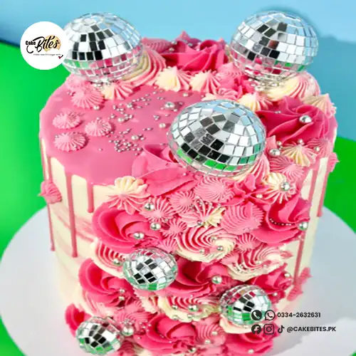 This vibrant disco-themed cake showcases a pink and cream buttercream base with a pink ganache drip. Decorated with shimmering disco balls and bold piped buttercream rosettes, available in a variety of ombré colour options! The cake shown in the image is a 6’’.