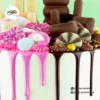 This vibrant and playful drip cake features a cream buttercream base with pink and chocolate ganache drips, topped with an assortment of chocolates, biscuits, and sweets. The cake in the image is a 6″.