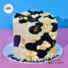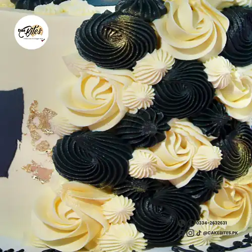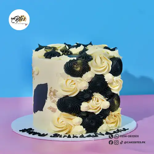 This elegant cake features striking monochrome tones, adorned with intricate buttercream swirls and delicate pearls. The cake in the image is a 6″.