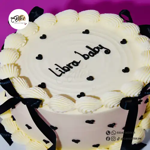 This elegant monochrome cake is adorned with delicate piped hearts and a bold buttercream swirl border, creating a chic and sophisticated look. The cake in the image is a 5″.