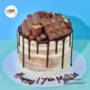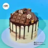 This indulgent cake features a blend of chocolate and vanilla buttercream on the exterior, complemented by a chocolate ganache drip. The top is covered with a variety of chocolates, giving it a fun and stylish look that’s perfect for special occasions. The cake in the image is a 6″.
