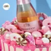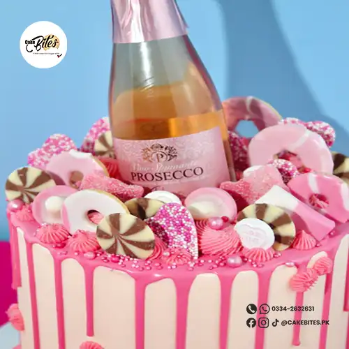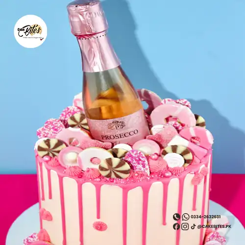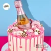 This celebratory cake showcases a smooth cream base with a vibrant pink drip, topped with a mini Prosecco bottle for a glamorous touch. Decorated with pink sprinkles, chocolate bites, and piped buttercream swirls. The cake in the image is a 6″.