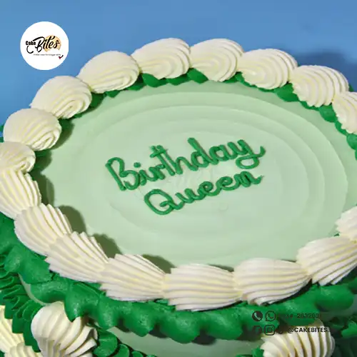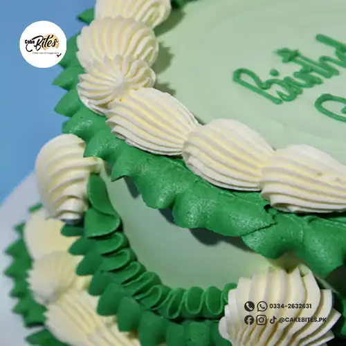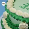 This handcrafted vintage-style cake showcases stunning shades of green, accented with intricate piped detailing and elegant shell motifs. The cake in the image is a 6″.