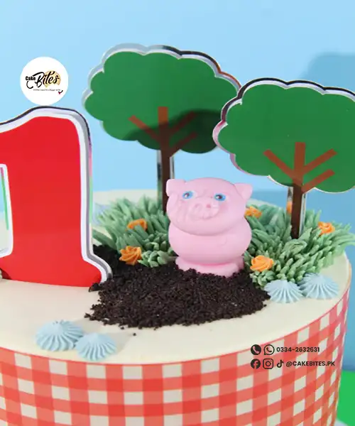 Bring the charm of the countryside to your celebration with our Gingham Farm Yard Cake. Wrapped in a classic red-and-white gingham print, this adorable cake features hand-piped buttercream grass, edible soil, and a cute fondant pig and horse figurine.