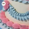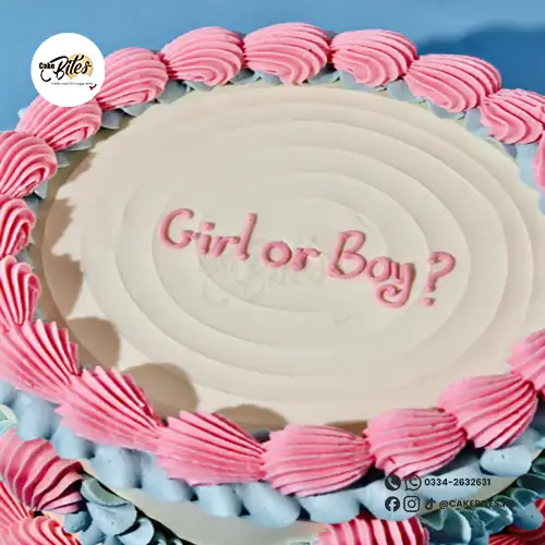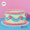 This handcrafted vintage-style cake features a cream base, elegantly decorated with delicate baby pink and baby blue piping. The cake in the image is a 6″.
