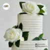 Featuring smooth ivory-toned iced tiers with subtle horizontal texturing, this cake is adorned with soft ivory roses and trailing green foliage, arranged to gently climb each tier. The organic placement of the florals creates a fresh, romantic look that feels effortlessly refined and perfectly suited to both classic and modern weddings.
