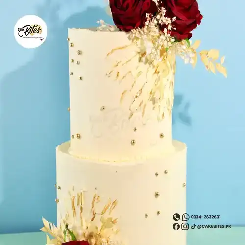 Featuring smooth ivory-toned iced tiers, this cake is adorned with delicate gold accents, subtle metallic detailing, and finished with rich deep-red roses and soft dried florals. The contrast of warm gold tones against elegant ivory icing creates a striking yet sophisticated aesthetic, perfect for glamorous celebrations and evening weddings.