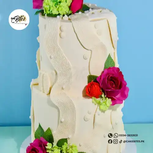 Featuring smooth ivory-toned iced tiers, this cake is adorned with striking hand-piped ripple panels that cascade organically across each tier. Finished with bold, colourful florals and subtle pearl accents, the Ripple Wedding Cake blends contemporary design with romantic elegance, creating a truly eye-catching centrepiece.