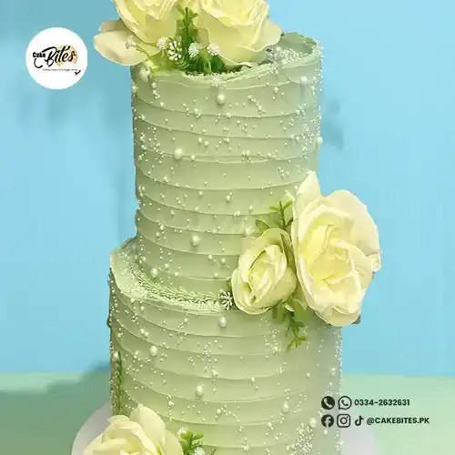 Finished in a delicate sage-green buttercream with subtle horizontal texture, each tier is adorned with scattered pearl accents and elegant floral detailing. Ivory roses and soft greenery are carefully placed throughout the cake, creating a timeless yet modern look that complements botanical, garden, and countryside weddings beautifully.