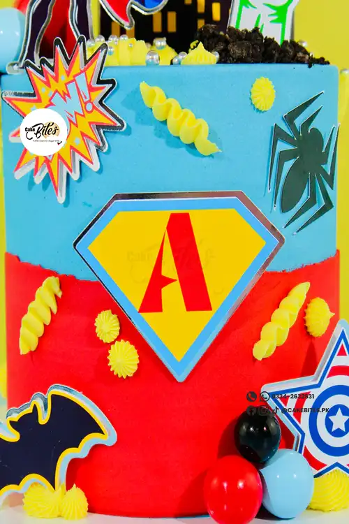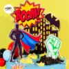 Featuring dynamic comic-style toppers, cityscape silhouettes, lightning bolts, stars and action bursts like BOOM! and POW!, this cake is designed to thrill every little hero.