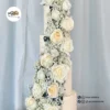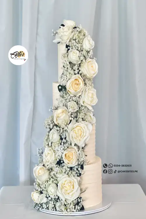 Featuring smooth, subtly textured iced tiers, this cake is adorned with an abundant cascade of entwined florals flowing organically from top to base. Soft ivory roses and delicate floral detailing intertwine effortlessly, creating a sense of movement and natural beauty that feels both luxurious and refined.