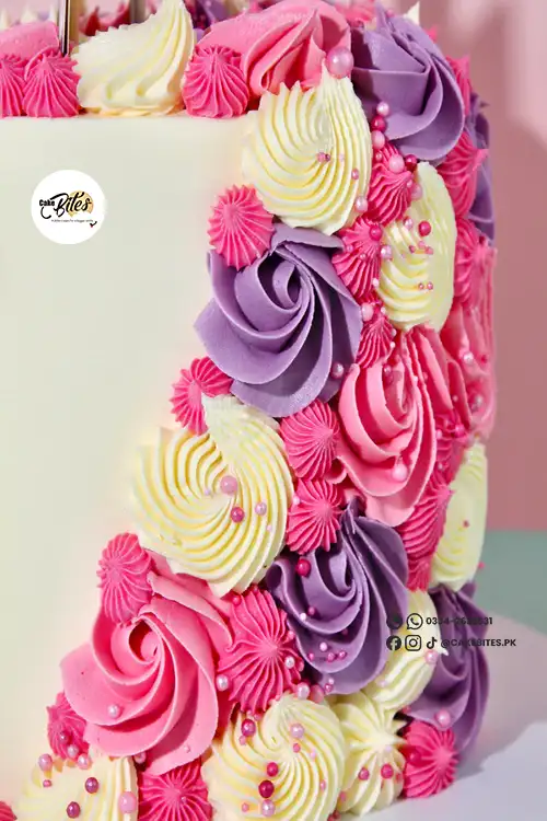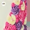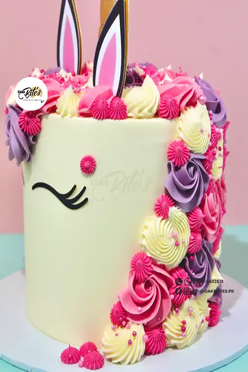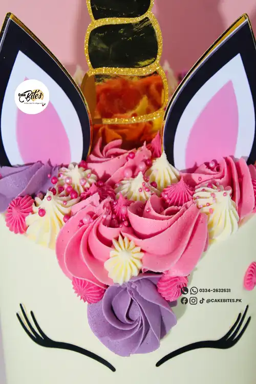 This elegant unicorn-themed cake is ideal for birthdays and magical celebrations! Decorated with swirls of pastel buttercream in soft shades of pink, purple, and cream, it features delicate piped rosettes and 2D character accents for a magical touch.