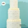 Featuring smooth ivory buttercream tiers, this cake is delicately finished with evenly spaced pearl accents and soft piped buttercream borders between each tier. The understated detailing creates a refined look that complements both traditional and modern wedding settings.